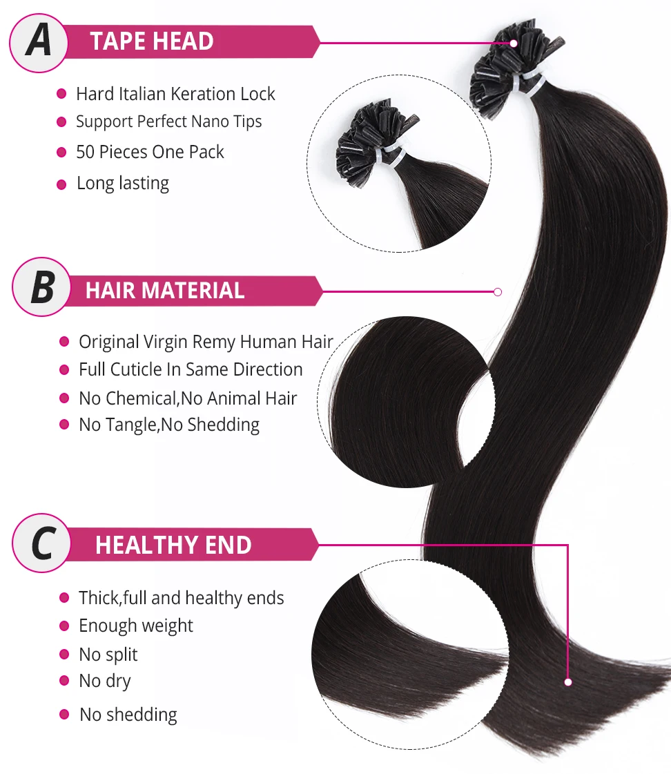 LuxyBeauty Nail Hair Fusion Hair Extensions #1B Natural Black 1g/pc 12"-22" Straight Machine Made R